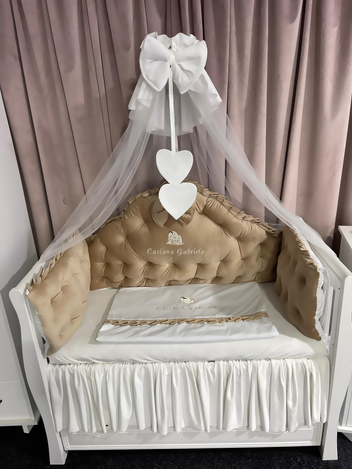 „Setul arată superb! Catifeaua bej este elegantă, iar bumbacul natural este foarte fin. Apărătorile sunt groase și oferă protecție reală. Broderia a ieșit perfect!”