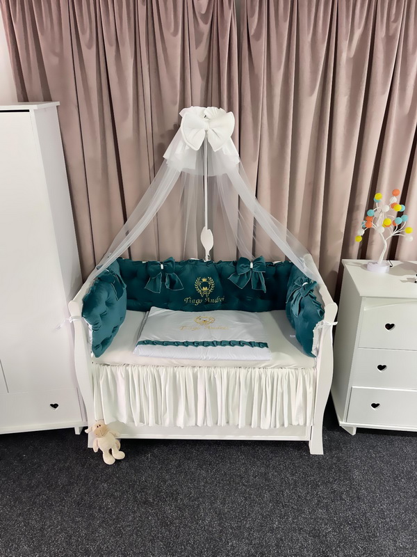 „lenjerie pătuț catifea verde smarald”, „set complet 11 piese bebeluși”, „lenjerie premium pătuț”, „catifea moale bebeluși”, „bumbac natural nou-născuți”, „lenjerie pătuț personalizabilă Royal”.